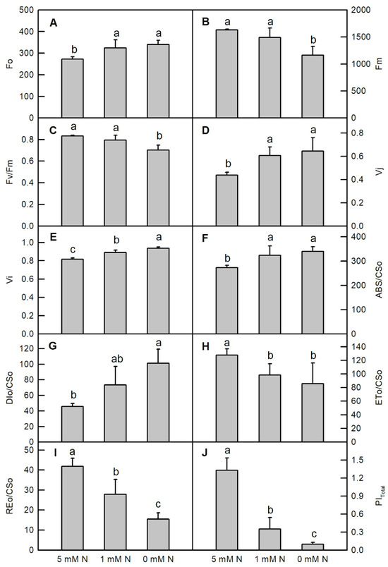 Effects of different nitrogen treatments on the primary fluorescence: Fo (A); maximum fluorescence: Fm (B); maximum quantum yield of primary photochemistry: Fm/Fo (C); variable fluorescence at t = 2 ms: Vj (D); variable fluorescence at t = 30 ms: Vi (E); absorbed photo radiation based on the cross section: ABS/CSo (F); dissipated energy based on the cross section: DIo/CSo (G); energy used in the electron transport: ETo/CSo (H); energy used in the reduction of end acceptor side of PSI: Reo/CSo (I); and the total performance index of PSs: PItotal (J) in dark-adapted O. sativa leaves. Bars represent means ± SD (n = 6). Different letters above the bars represent a significant difference at p < 0.05.