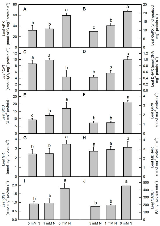 Nitrogen deficiency dramatically increased the activities of leaf APX (Figure 5A; increased by 86.3%), leaf DHAR (Figure 5D; increased by 132%), leaf GlPX (Figure 5F; increased by 195%), leaf GR (Figure 5G; increased by 43%), and leaf GST (Figure 5I; increased by 98.7%), leaf OASTL (Figure 5J; increased by 155%); however, it lowered the activity of leaf CAT (Figure 5C; decreased by 49.6%) in O. sativa seedlings, when compared to the controls. Decreasing the N supply gradually increased the activities of leaf GuPX (Figure 5B) and leaf SOD (Figure 5E), but it did not alter the activity of leaf MDHAR (Figure 5H). Except for increasing the activities of leaf GuPX (Figure 5B) and leaf SOD (Figure 5E), low N did not alter the activities of the abovementioned enzymes in O. sativa leaves when compared to the controls.