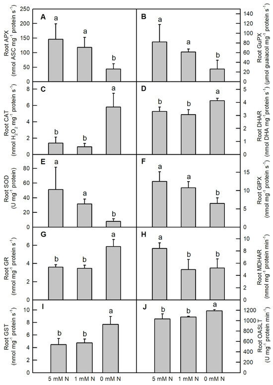 Effects of different nitrogen treatments on the activities of antioxidant enzymes (A–H); and sulfur metabolism related enzymes (I,J) in O. sativa roots. Bars represent means ± SD (n = 3). Different letters above the bars represent a significant difference at p < 0.05.