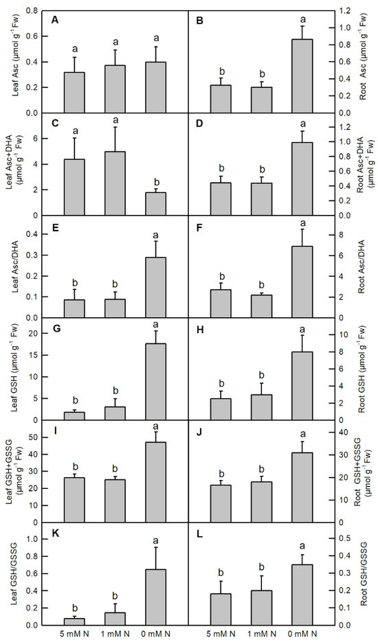 Nitrogen deficiency substantially increased the contents of root Asc (increased by 166%), root Asc+DHA (increased by 124%), leaf GSH (increased by 863%), root GSH (increased by 218%), leaf GSH+GSSG (increased by 79.3%), root GSH+GSSG (increased by 86.6%), and the ratios of leaf Asc/DHA, root Asc/DHA, leaf GSH/GSSG, and root GSH/GSSG in O. sativa (Figure 7B,D–L), but decreased the content of leaf Asc+DHA (Figure 7C). No significant difference was observed in the content of leaf Asc in O. sativa under different N supplies (Figure 7A).
