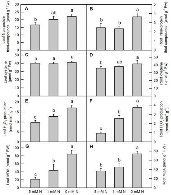 Effects of different nitrogen treatments on the contents of non-protein thiol compounds (A,B); cysteine (C,D); MDA (E,F); and the production of H2O2 (G,H) in the leaves and roots of rice. Bars represent means ± SD (n = 3). Different letters above the bars represent a significant difference at p < 0.05.