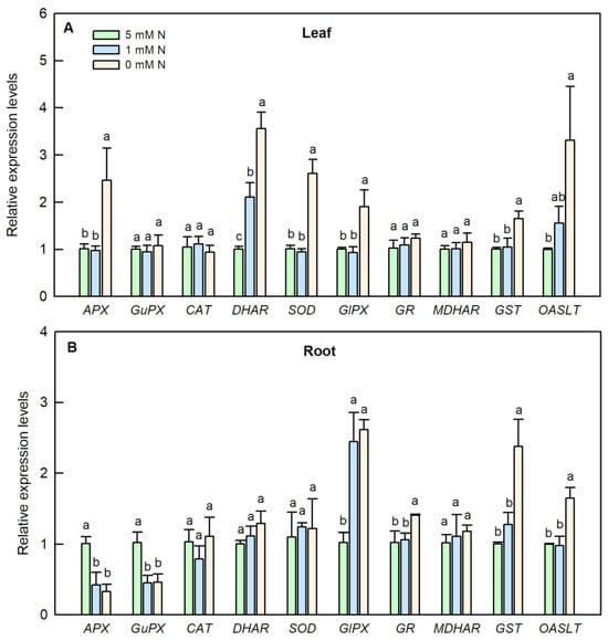 Effects of different nitrogen treatments on the gene expression patterns of antioxidant related enzymes in the leaves (A); and roots (B) of rice. Bars represent means ± SD (n = 3). Different letters above the bars of each gene represent a significant difference at p < 0.05.