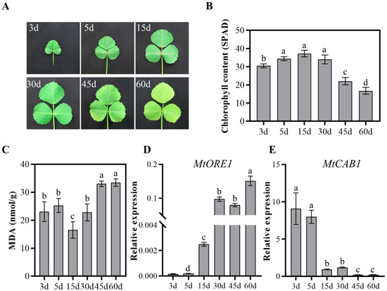 Physiological and biochemical analysis of leaf growth and senescence in Medicago truncatula. (A) Phenotype of the fifth compound leaf at different growth and senescence stages. The day when the fifth compound leaf emerged is considered as day 1. (B) Chlorophyll content in the fifth compound leaf at 3 d, 5 d, 15 d, 30 d, 45 d and 60 d. The chlorophyll content was obtained by measuring the SPAD value using a chlorophyll meter. Date is shown as mean ± SD (n = 4). Significant differences revealed by Tukey’s multiple comparison test are indicated by letters above bars (p < 0.05). (C) MDA content was measured in the fifth compound leaf at indicated time points. Date is shown as mean ± SD (n = 4). Significant differences revealed by Tukey’s multiple comparison test are indicated by letters above bars (p < 0.05). (D,E) Expression of senescence up-regulated and down-regulated marker genes MtORE1 (D) and MtCAB1 (E) at 3 d, 5 d, 15 d, 30 d, 45 d and 60 d. Date is shown as mean ± SD (n = 3). Significant differences revealed by Tukey’s multiple comparison test are indicated by letters above bars (p < 0.05).