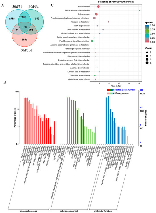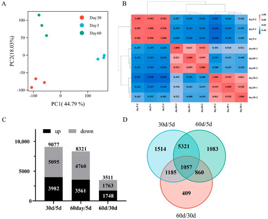 Using DESeq2 with screening criteria of adjusted p-value < 0.01 and |log2 (fold change)|>1 or <−1, the differentially expressed genes (DEGs) were identified in each group compared with one another (Table S2). A comparation between 30 d and 5 d revealed a total of 9077 DEGs, consisting of 5095 down-regulated genes and 3982 up-regulated genes. A comparable number of DEGs was obtained between 60 d versus 5 d, with a total of 8321 DEGs, including 4760 down-regulated genes and 3562 up-regulated genes. Fewer DEGs were identified between 60 d versus 30 d, totaling 3511 DEGs, with 1763 down-regulated genes and 1748 up-regulated genes, suggesting a similar gene expression profile between 60 d and 30 d (Figure 2C). Following a comparative analysis of DEGs obtained from different combinations, it was found that 1057 DEGs were shared among the comparison (Figure 2D).