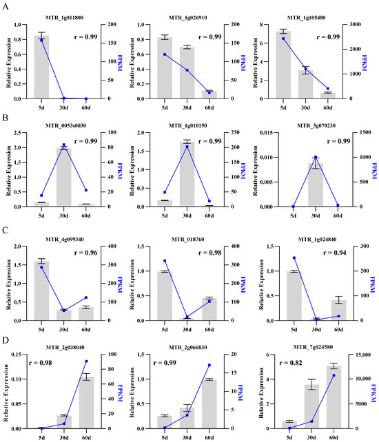 In order to confirm the accuracy of RNA-seq results, quantitative real-time PCR (qRT-PCR) was performed on selected genes exhibiting different expression patterns in a biological independent experiment. A total of twelve candidate genes were selected, categorized into four distinct expression profiles: continuous up-regulation genes, continuous down-regulation genes, genes that were up-regulated at 30 d and then down-regulated at 60 d and genes that were down-regulated at 30 d, then up-regulated at 60 d. The results showed that the expression of the specific gene in RNA-seq was consistent with the one detected in qRT-PCR (Figure 3). The Pearson correlation coefficient was calculated by SPSS 17.0 software to evaluate the correlation between different detection methods. Overall, the results obtained from qRT-PCR were in line with the RNA-seq data, showing a correlation coefficient exceeding 0.82 (Figure 3). Thus, our data demonstrates the reliability and consistency of transcriptome analysis, which can be utilized for further investigating genes related to leaf senescence regulation in M. truncatula.