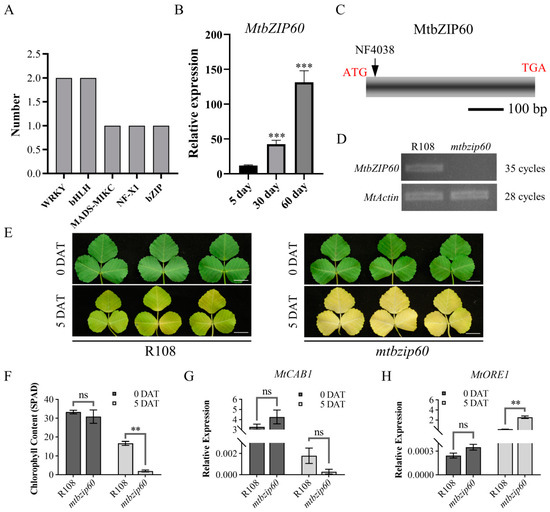 As only a limited number of bZIP TFs have been identified as regulators of leaf senescence in different species, the identified bZIP TF MtbZIP60 was chosen to perform further functional analysis. We first validated the expression trend of MtbZIP60 during leaf growth and senescence. The result showed a significant increase in MtbZIP60 expression level as leaf aging (Figure 6B, Table S1). In order to investigate the roles of MtbZIP60, we obtained a Tnt1-inserted mutant line mtbzip60 through screening the mutant collection. The MtbZIP60 gene contains a single exon, with the Tnt1 insertion at 16 bp downstream of the translational start codon (Figure 6C). qRT-PCR analysis showed that the insertion of Tnt1 leads to the loss of full-length expression of MtbZIP60 (Figure 6D). Dark treatment is an effective method to induce leaf senescence and is commonly used to simulate synchronous senescence [15]. Therefore, the fifth fully expanded compound leaf from apex was detached for dark treatment. After a five-day dark treatment, the detached leaves of mtbzip60 showed an accelerated leaf senescence compared with the wild-type R108 (Figure 6E). The degradation of chlorophyll, as reflected by the SPAD value, was significant higher in mtbzip60 compared with R108, which is consistent with the differences observed in the senescence process (Figure 6F). In addition, the senescence marker genes, MtORE1 and MtCAB1, exhibited corresponding alterations as well (Figure 6G,H). These results suggested that MtbZIP60 acts as a novel regulator of leaf senescence in M. truncatula.