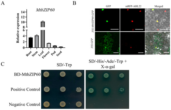 Expression pattern, subcellular localization and transcriptional activity analysis of MtbZIP60. (A) Expression pattern of MtbZIP60 in different tissues detected using qRT-PCR. MtActin was used as an internal control. (B) Subcellular localization of GFP and MtbZIP60-GFP in epidermal cells of tobacco leaf. The mRFP-AHL22 fusion was used as nuclear localization marker. Green represents the green fluorescent protein, red represents the red fluorescent protein, and yellow is obtained by combining the two fluorescent proteins. Bars = 20 μm. (C) Transactivation activity analysis of MtbZIP60 in yeast. Full-length CDS of MtbZIP60 and TaNAC6 were cloned into the pGBKT7 vector and transformed into yeast strain AH109. Transformants harboring different plasmids were inoculated onto selective medium, with BD-TaNAC6 serving as the positive control.