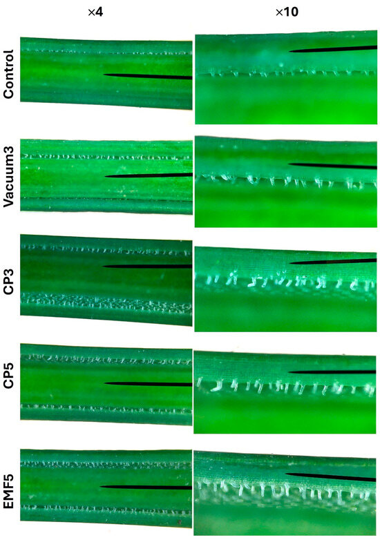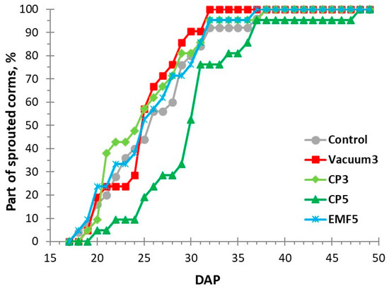 4.2. Corm Treatment by CP, Vacuum, and EMF