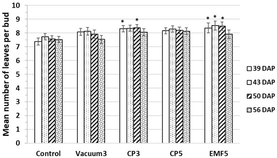 | Bud Number per Corm | Control | Vacuum3 | CP3 | CP5 | EMF5 |