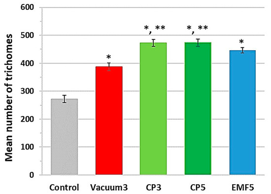 - Ivankov, A.; Nauciene, Z.; Zukiene, R.; Degutyte-Fomins, L.; Malakauskiene, A.; Kraujalis, P.; Venskutonis, P.R.; Filatova, I.; Lyushkevich, V.; Mildaziene, V. Changes in growth and production of non-psychotropic cannabinoids induced by pre-sowing treatment of hemp seeds with cold plasma, vacuum and electromagnetic field. Appl. Sci. 2020, 10, 8519. [Google Scholar] [CrossRef]