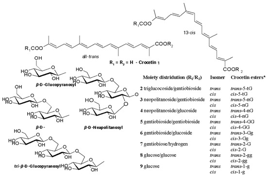 | cis-crocetin (β-D-neapolitanosyl)(β-D-gentiobiosyl) ester | - | c-5nG | 42.119 | 242, 260, 414, 436 | 1139 | C50H74O29 |
