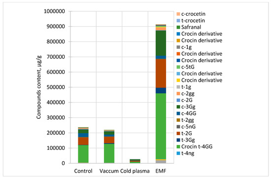 - Amini, M.; Ghoranneviss, M.; Abdijadid, S. Effect of cold plasma on crocin esters and volatile compounds of saffron. Food Chem. 2017, 235, 290–293. [Google Scholar] [CrossRef]