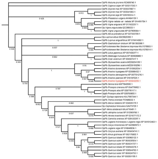 Phylogenetic analyses of the ClpP6 family proteins from peanut plants and other plant species. Red font letters mean AhClpP6 of Arachis ipaensis ClpP6.