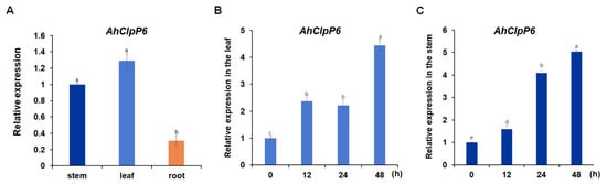 AhClpP6 expression profile in peanut plants. (A) in root, stem, and leaf tissues. (B,C) in the leaves (B) and stems (C) under 100 μM AlCl3 treatment for 0, 12, 24, and 48 h. Values show means ± SD (n = 3). Different letters indicate significant differences at p < 0.05. All experiments were repeated at least three times with similar results.