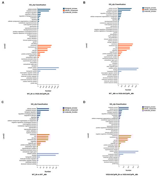 GO enrichment of DEGs between WT and VIGS-AhClpP6 in response to Al3+ stress. (A) Enriched GO terms for WT_0h vs. VIGS-AhClpP6_0h; (B) WT_48h vs. VIGS-AhClpP6_48h; (C) WT_0h vs. WT_48h; and (D) VIGS-AhClpP6_0h vs. VIGS-AhClpP6_48h. The X-axis represents the number of genes, and the Y-axis represents the functional category.