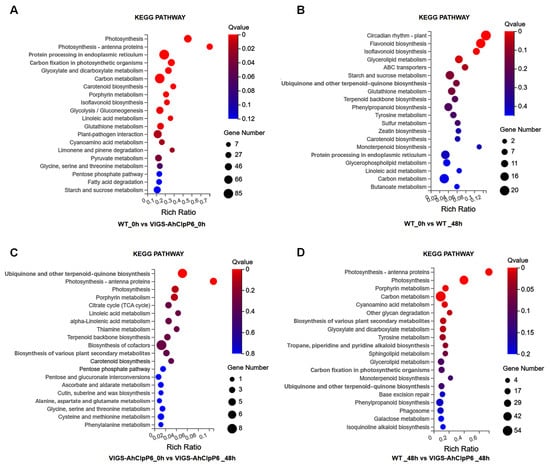 KEGG pathway enrichment of DEGs between WT and VIGS-AhClpP6 seedlings in response to Al3+ stress. (A) Enriched GO terms for WT_0h vs. VIGS-AhClpP6_0h; (B) WT_0h vs. WT_48h; (C) VIGS-AhClpP6_0h vs. VIGS-AhClpP6_48h; and (D) WT_48h vs. VIGS-AhClpP6_48h. The X-axis represents the rich ratio for the genes, and the Y-axis represents the functional category.