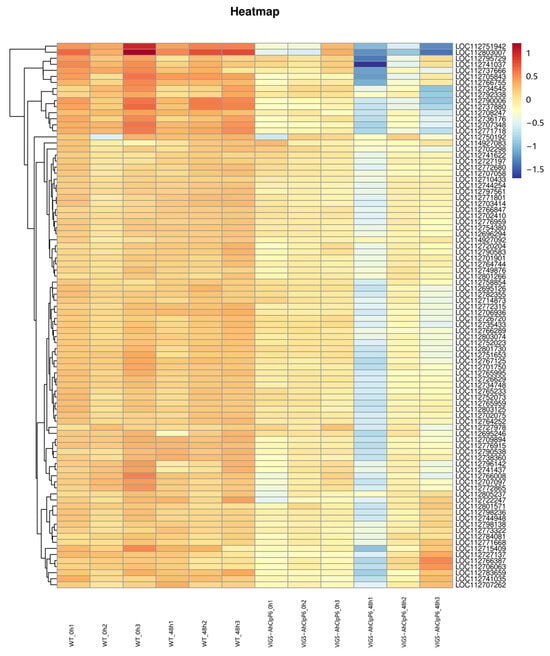 Based on previous results of KEGG pathway enrichment, 90 genes whose pathway is photosynthesis and photosynthesis-antenna proteins were selected (Figure 6). Among the 90 DEGs, there were 36 upregulated genes (0.002 ≤ log2fold-change ≤ 0.535) and 54 downregulated genes (−0.88 ≤ log2fold-change ≤ −0.0007) in WT_0h compared with WT_48h; 90 upregulated genes (0.05 ≤ log2fold-change ≤ 3.43) in VIGS-AhClpP6_0h compared with WT_0h; 16 upregulated genes (0.03 ≤ log2fold-change ≤ 1.13) and 74 downregulated genes (−3.87 ≤ log2fold-change ≤ −0.03) in VIGS-AhClpP6_0h compared with VIGS-AhClpP6_48h; 88 upregulated genes (0.27 ≤ log2fold-change ≤ 6.57) and 2 downregulated genes (−0.22 ≤ log2fold-change ≤ −0.13) in VIGS-AhClpP6_48h compared with WT_48h. In particular, two chlorophyll a-b binding protein of LHCII type 1 genes (LOC112803007 and LOC112751942) were most significantly upregulated both in VIGS-AhClpP6_0h vs. WT_0h, with log2fold-change ranging from 2.73 to 3.43, and VIGS-AhClpP6_48h compared with WT_48h, with log2fold-change ranging from 4.81 to 6.57. But these two genes were not significantly downregulated in WT_0h compared with WT_48h, with log2fold-change ranging from −0.78 to −0.72, while being significantly downregulated in VIGS-AhClpP6_0h compared with VIGS-AhClpP6_48h, with log2fold-change ranging from −3.87 to −2.85.