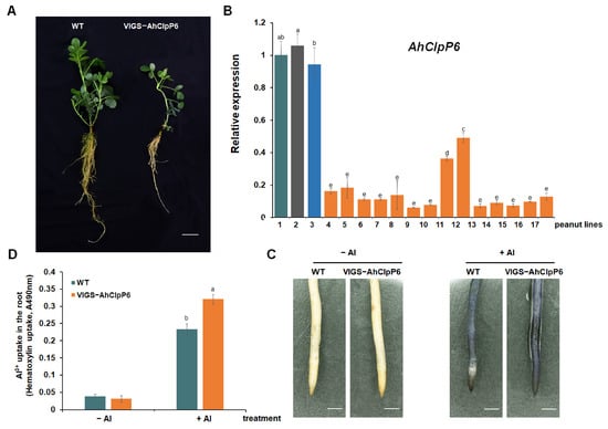 Functional characterization of AhClpP6 in peanut plants. (A) Phenotypes of knockdown of AhClpP6 peanut lines (VIGS-AhClpP6); scale bar, 5 cm. (B) RT-qPCR analysis of AhClpP6 expression in peanut leaves; X-axis represents different peanut lines. Peanut lines: 1, WT; 2, empty; 3, positive control; 4–17, VIGS-AhClpP6. (C,D) Effects of Al3+ stress on plant growth. (C) Hematoxylin staining of the root tips; bar, 1 mm. (D) Al3+ uptake in the root tips. −Al means without Al3+ treatment; +Al means under 100 μM AlCl3 treatment for 48 h. Values are means ± SD (n = 3). Different letters indicate significant differences at p < 0.05. All experiments were repeated at least three times with similar results.