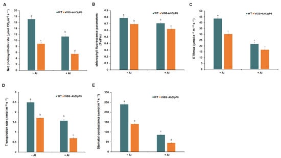Photosynthesis decreased after 24 h of Al3+ treatment in the WT seedlings, but this decrease was significantly greater in the AhClpP6 knockdown lines (VIGS-AhClpP6) (Figure 8). The net photosynthetic rate, the Fv/Fm value, and the ETRmax for the VIGS-AhClpP6 lines were significantly lower than those for the WT, which was consistent with their chlorotic appearance. The net photosynthetic rates for both the WT and VIGS-AhClpP6 lines were also significantly lower after Al3+ treatment. The PSII photochemical efficiency and the ETRmax values for the leaves from the WT and VIGS-AhClpP6 lines were also significantly inhibited after Al3+ stress. Furthermore, compared to the control plants, Al3+ treatment decreased the transpiration rate and stomatal conductance by 44% and 53% in the AhClpP6 mutant lines, respectively. In summary, these results suggest that AhClpP6 positively affects photosynthesis. The above results show that AhClpP6 enhances peanut Al3+ tolerance by upregulating photosynthesis.