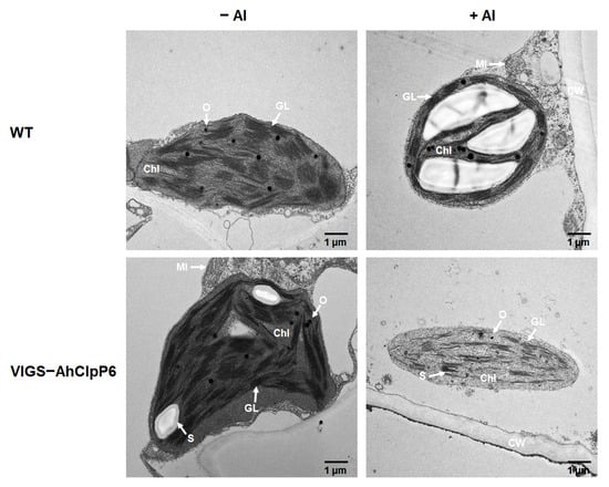 Based on these results, we hypothesized that AhClpP6 could be required in chloroplast homeostasis under Al3+ stress. Therefore, the chloroplast ultrastructure of leaves and stems from the AhClpP6 knockdown peanut lines was further observed. The chloroplasts in the VIGS-AhClpP6 peanut seedlings were smaller and more flattened and disordered than those in the WT with or without Al treatment (Figure 9 and Figure 10). Taken together, it is proposed that the integrity and order of chloroplasts may have been related to the better performance of peanut plants under Al3+ stress, which represents a high potential in coordinating with photosynthesis and therefore enhances plant tolerance under Al3+ exposure, and AhClpP6 appears to play an indispensable role in this process. AhClpP6 may be utilized in generating genetically engineered crops with enhanced resistance to Al3+ stress.