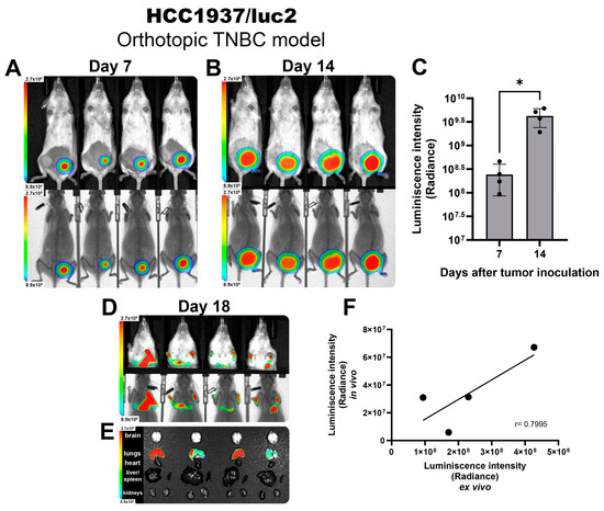 Next, we established an orthotopic model of TNBC by inoculating HCC1937/luc2 cells into the mammary fat pad of female NOD immune defective mice to allow the development of human-origin tumors. After 7 days post-inoculation, we observed a well-established tumor that emitted a colocalized BL signal (Figure 1A) that was homogeneous and consistent between all tested animals. Tumor growth was monitored 2 times per week. At day 14, a strong BL signal could be detected from the tumors (Figure 1B), and for both timeframes shown, the BL intensity was quantified, showing an increased signal detection corresponding to the change in tumor volume through the days with very low variability between individuals. This demonstrates that luciferase activity could be extrapolated to precisely follow tumor size, allowing for more accurate comparisons between groups (Figure 1C).