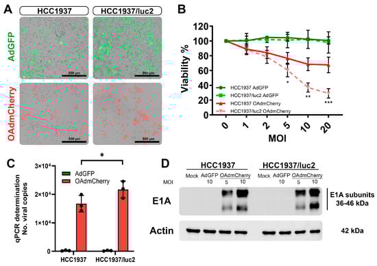 Replication of the OAdmCherry after infecting the cell line HCC1937/luc2 was determined by detection of the viral particles released to the supernatant 24 and 48 h post-infection. The viral genome was purified using a NucleoSpin virus column (Cat. 740983, Takara, San Jose, CA, USA), and the viral copy number was quantified using the Adeno-X qPCR Titration Kit (Cat. 632252, Takara).