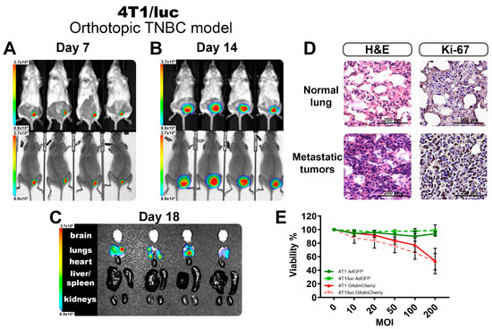We stably transfected one human TNBC HCC1937 cell line and one mouse lung cancer CMT64 cell line for the expression of luciferase (HCC1937/luc2 and CMT64/luc2, respectively). We confirmed the production of BL signal in vitro for both cell lines (Figure S1A,B). Furthermore, we compared Ad’s transduction and killing efficacy between CMT64 (parental) and CMT64/luc2 (modified). It was found that both cell lines were similarly infected by AdGFP and killed by OAdmCherry (Figure S1C,D).