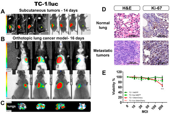Monitoring by the BLI of an orthotopic TC-1/luc lung cancer model. (A) Subcutaneous tumors confirm the emission of BLI from the TC-1/luc cell line. (B) The detection of orthotopic lung tumors in vivo BLI imaging, and (C) the corresponding ex vivo lungs showing the presence of several tumoral nodules. (D) H&E and IHC staining confirmed the presence of tumor infiltrates and increased proliferation in the lungs. (E) Viability comparison between TC-1 and TC-1/luc after 72 h infection with OAds. The graphs show 3 independent experiments (Mean ± SD, *** p < 0.001).