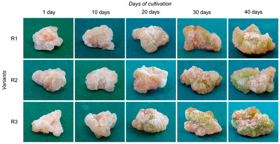 For variant R3, the presence of light green pigmentation was shown, which indicated the formation of chlorophyll-containing cells. On the 30th day, this process was characteristic of all calli variants. It was most pronounced in variant R3. By the 40th day, all calli acquired a green color of varying intensity, as follows: variant R1—light green, variant R2—green, variant R3—bright green. It should also be noted that during the entire cycle of cultivation, in light of varying intensity, the calli had compact structures and were dense.