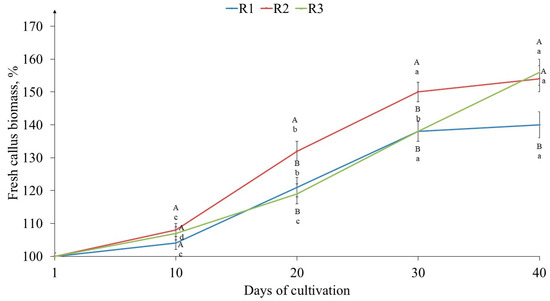 Biomass growth dynamics of tea callus cultures grown under the following different intensities of light exposure during the cultivation cycle (40 days): R1—50 µmol·m−2·s−1; R2—75 µmol·m−2·s−1; R3—100 µmol·m−2·s−1. Results are expressed as means ± SDs, n = 3. The significant differences at p < 0.05 are denoted by different Latin letters, as follows: uppercase letters indicate significant differences between different light intensities in alphabetic order from highest to lowest, and lowercase letters indicate significant differences between duration of light exposure in alphabetic order from highest to lowest. Pairwise multiple comparisons were carried out using Tukey’s range test.