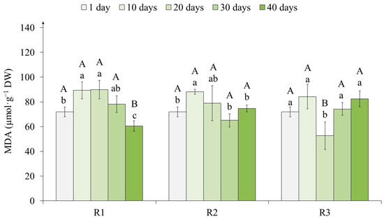 The malondialdehyde (MDA) content in tea callus cultures grown under the following different intensities of light exposure during the cultivation cycle (40 days): R1—50 µmol·m−2·s−1; R2—75 µmol·m−2·s−1; R3—100 µmol·m−2·s−1. Results are expressed as means ± SDs, n = 3. The significant differences at p < 0.05 are denoted by different Latin letters, as follows: uppercase letters indicate significant differences between different light intensities in alphabetic order from highest to lowest, and lowercase letters indicate significant differences between duration of light exposure in alphabetic order from highest to lowest. Pairwise multiple comparisons were carried out using Tukey’s range test.