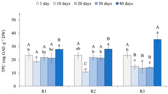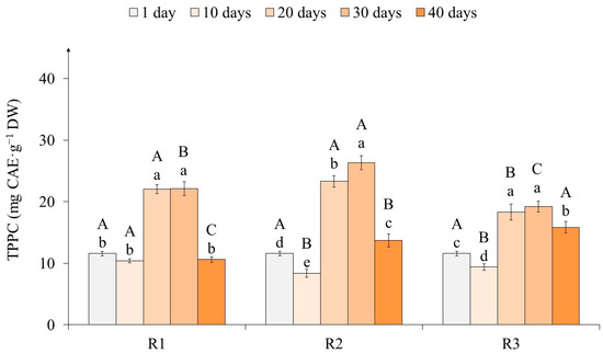 The total phenolic content (TPC) in tea callus cultures grown under the following different intensities of light exposure during the cultivation cycle (40 days): R1—50 µmol·m−2·s−1; R2—75 µmol·m−2·s−1; R3—100 µmol·m−2·s−1. Results are expressed as means ± SDs, n = 3. The significant differences at p < 0.05 are denoted by different Latin letters, as follows: uppercase letters indicate significant differences between different light intensities in alphabetic order from highest to lowest, and lowercase letters indicate significant differences between duration of light exposure in alphabetic order from highest to lowest. Pairwise multiple comparisons were carried out using Tukey’s range test.