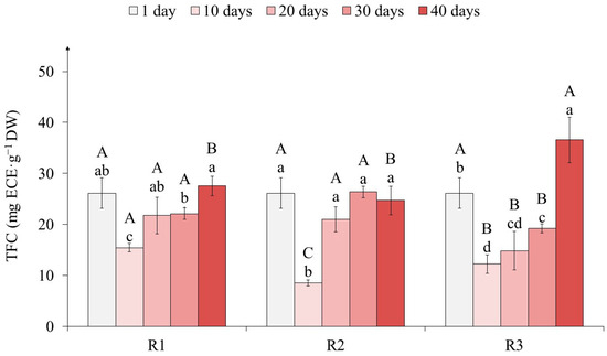 The total flavanol content (TFC) in tea callus cultures grown under the following different intensities of light exposure during the cultivation cycle (40 days): R1—50 µmol·m−2·s−1; R2—75 µmol·m−2·s−1; R3—100 µmol·m−2·s−1. Results are expressed as means ± SDs, n = 3. The significant differences at p < 0.05 are denoted by different Latin letters, as follows: uppercase letters indicate significant differences between different light intensities in alphabetic order from highest to lowest, and lowercase letters indicate significant differences between duration of light exposure in alphabetic order from highest to lowest. Pairwise multiple comparisons were carried out using Tukey’s range test.
