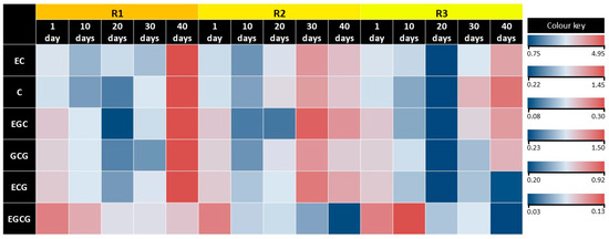 It should also be noted that the contents of individual components of the catechin complex in tea callus cultures reached higher values in the final stages of exposure to light of varying intensity, as follows: in R1 and R3 on the 40th day and in R2 on the 30th day. From the first to the tenth day of light exposure, there was an insignificant decrease (17–27%) in all variants, except for EGCG, the amount of which did not change in R1 and increased in R3 (by 40%). By the 20th day of light exposure, the changes in the accumulation of individual catechins were of a different nature. In the R1 variant, only the EC content increased slightly (by 15%), while the amounts of other components of the catechin complex decreased relative to the 10th day, especially EGC and GCG (by 40%). In the R2 variant, during this period, not only the EC content but also the C and GCG contents increased (by 54, 60, and 65%, respectively); the other components of the catechin complex remained at the same level. A different trend is typical for R3, in which the number of all individual components of the catechin complex decreased (from 50 to 60% relative to the 10th day of light exposure). On the 30th day of light exposure, there were no changes in the content of most components of the catechin complex in the R1 variant, except for an increase in C and EGC levels (by 70% and 60%, respectively) relative to the 20th day of light exposure. In the R2 variant, the accumulation of these metabolites in most cases increased in the following series: EGC by 180%, ECG by 126%, EC by 86%, GCG by 60%, and C by 53%. The exception was EGCG, the content of which did not change. As for the R3 variant, in this case, the greatest increase was noted for C (by 295%) and to a lesser extent for GCG and ECG (by 139% and 125%, respectively), as well as EGC and ECG (by 88% and 55%, respectively). On the 40th day of the light exposure, the contents of most compounds of the catechin complex in the variants R1 and R3 increased relative to the 30th day, while in the R2 variant, it decreased. The R1 variant had an equal and significant increase in EC and GCG (by 240%) content and to a lesser extent, ECG (by 155%), as well as EGC (by 130%), and the amount of EGCG did not change. In R2, the contents of all components of the catechin complex were 18–25% lower than those of the 30th day of light exposure, with the exception of EGCG, the level of which did not change. In R3, the amounts of metabolites of a catechin nature, such as EC (by 180%), GCG (by 75%), and C and EGC (by 45%) increased. As for EGC and EGCG, their contents decreased (by 32 and 50%, respectively).