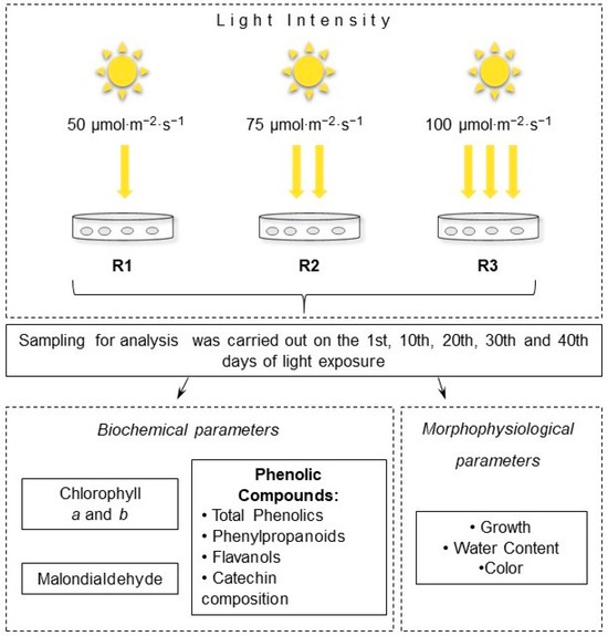 The important role of light in the regulation of morphophysiological and biochemical characteristics of plants is known [1,8]. It is an essential factor for the formation of chloroplasts—sources of energy and metabolites necessary for the functional activity of cells [9,11]. Its effect leads to the activation of photorespiration, the opening/closing of stomata, the regulation of flowering processes, and plant productivity, including the formation of pharmacologically valuable metabolites [3]. Despite the rather long history of studying the light regulatory role in relation to many physiological and biochemical processes in plant organs, tissues, and cells, there is still an opinion about the specificity of their response (especially during primary exposure) and the dependence on the intensity of light’s action [7,14]. In addition, in this case, great opportunities are provided by in vitro plant cultures, which are grown under strictly controlled conditions, consist of cells with a low level of differentiation, and retain many of the properties of the original explants [30,44]. In addition, due to the increasing risk of environmental impacts and the need to preserve plant raw materials, including industrial ones, understanding the mechanisms and methods of regulating the production capacity of cell cultures, including when using exposure to light, is important for the biotechnological production of valuable plant metabolites. This is also applied to PC, which are substances with high antioxidant activity that are successfully used in the treatment of human diseases of various etiologies [23,24].