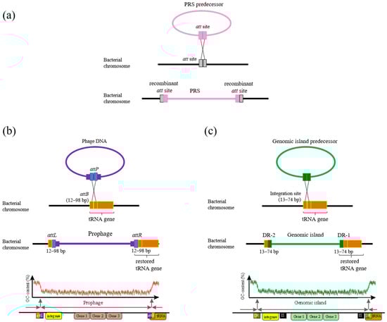 The integration of a PRS into the host bacterial genome occurs through site-specific recombination with the participation of enzymes (Figure 1a), which are conserved site-specific tyrosine and serine recombinases belonging to two unrelated families. These recombinases are widely distributed in bacterial and viral genomes and are often referred to as “phage-like integrases”, responsible for the mobility of mobile genetic elements of different types [,].