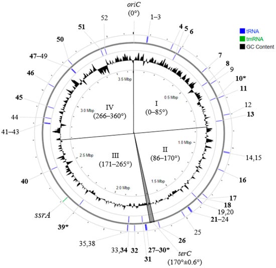 Localization of essential tRNA genes on S. meliloti 1021 chromosome. Designations: 1-52—ordinal numbers of tRNA genes (in the text 001-052); oriC and terC—origin and terminus of replication, respectively; I–IV—quarters of the chromosome, defined relative to oriC and terC; in bold—ordinal number of tRNA genes with integrated PRSs; *—“hot spots” of PRS integration (genes 030 and 039) and spot of preferential integration (gene 010) (see text).