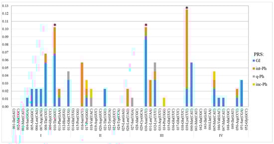 Frequencies of PRS integration in essential tRNA genes of S. meliloti. Designations: along the abscissa axis—the signature combines the ordinal number of tRNA genes, with a corresponding amino acid and anticodon following the dash (see Table 3); along the abscissa axis—frequency of occurrence of PRSs integrated into different tRNA genes; *—tRNA genes at “hot spots” of integration (genes 030 and 039) and spot of preferential integration (gene 010); I–IV—chromosome quarters defined relative to oriC and terC (see Figure 2).