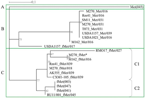 Phylogenetic analysis was performed on the nucleotide sequences of genes encoding tRNAMet(CAU)PRS and tRNAfMet(CAU)PRS, which occurred most frequently in the genomes of the strains studied (frequency of 0.68). As a result, we analyzed the sequences of 17 genes encoding tRNAMet(CAU)PRS and tRNAfMet(CAU)PRS, as well as the sequences of genes 003, 041, and 047, belonging to the three rrn operons, and gene 045, located on the chromosome (Figure 4). Three clusters, A, B, and C, were identified. Cluster A had only the sequence of gene 045 and was identical in all S. meliloti strains studied (Figure 4). Cluster B included the sequences of eight tRNAfMet(CAU)PRS genes belonging to phiLM21-like phages, as well as the sequence of the tRNAfMet(CAU)PRS gene belonging to an inc-Ph similar to Paracoccus phage Shpa (the bootstrap value was 75%; Figure 4). The third cluster (C) comprised two monophyletic subclusters, C1 and C2 (bootstrap 77%). Subcluster C1 combined the sequences of seven tRNAfMet(CAU)PRS-encoding genes belonging to PRSs similar to different phages, including the rhizobiophages Sinorhizobium phage phiLM21 and Rhizobium phage 16-3, as well as phages Shpa and NYA-2014a, which infect Paracoccus and Sulfitobacter, respectively (Table 4). Subcluster C2 was represented by three tRNAfMet(CAU) genes in rrn operons, as well as the sequence of the tRNAfMet(CAU)PRS gene, which was part of a Ph similar to Rhizobium phage 16-3 and was integrated into gene 045 (strain RU11/001; Figure 4).
