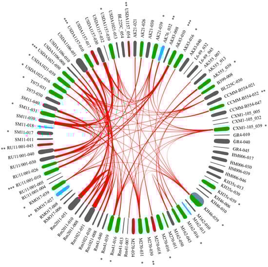 The synteny blocks of PRSs integrated into essential tRNA genes of S. meliloti. Designations: there are sequences of PRSs around the circle; PRS signature: the strain that contained a PRS, with the ordinal number of the tRNA gene following the dash (see Table S2, Figure 2). Type of PRS indicated by color: gray—GI, green—int-Ph, blue—q-Ph, red—inc-Ph (see text). The red lines inside the circle connect matching sequences between pairs of PRSs (see Section 4 Materials and Methods; Table S3B). Detailed blastn PRS alignment results are in Table S3A. *, **, ***—PRS similar to phages phiLM21, 16-3, and RR1-A, respectively (see text). USDA1157-054, BL225C-054, and USDA1021-013—PRSs localized on the megaplasmid pSymB.
