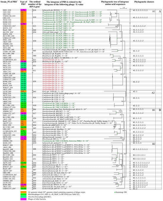 We analyzed the similarities between the amino acid sequences of PRS integrases and Azospirillum phage Cd integrase. Both integrase sequences had a higher degree of similarity when PRS integration occurred at the “hot spot”, gene 039 (subcluster A1.2.2 (bootstrap 62)), compared with when the PRS had integrated into another gene, such as gene 031 (subcluster A1.2.1.2.1 (bootstrap 100); E-value 4 × 10−16–6 × 10−16 and 4 × 10−11–1 × 10−10, respectively; Figure 6). In the cases where PRSs integrated into genes 021 and 011, the corresponding integrases had a lower degree of similarity to the integrase sequence of Azospirillum phage Cd and belonged to the following subclusters: A1.2.1.1.2.1 (bootstrap 100) and A1.2.1.2.2 (bootstrap 100; Figure 6, Table S4), respectively. Two GIs also appeared to be integrated into the same gene 039 in different strains. However, the integrase of one of the GIs was similar to that of Burkholderia phage KS9, and that of the second GI was similar to that of Salmonella phage epsilon15. These integrases belonged to different clusters (clusters B2.1.2.2.1.2 (bootstrap 100) and B2.1.1.1 (bootstrap 84)) (Figure 6).