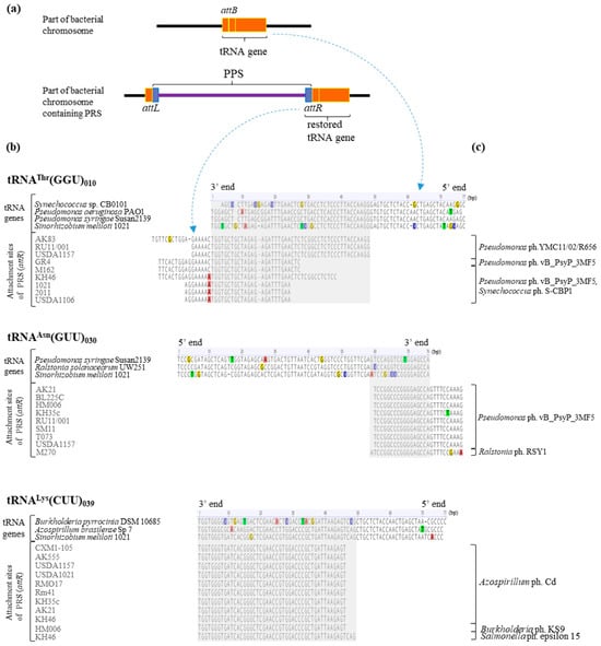 Using two integration “hot spots”, genes 039 and 030, and gene 010, we analyzed the complementarity in the sequences of the attP and attB sites corresponding to PRSs and the sequence of the corresponding tRNA gene in S. meliloti. The gene sequences of the corresponding tRNAs of other bacterial species that were potential hosts for the aforementioned phage groups were used as a comparison group.