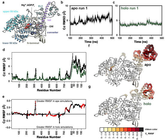 OM allosterically modulates lever arm dynamics in myosin. (a) Initial coordinates of OM−bound (holo) myosin used in this study. The major domains are highlighted: N–terminal domain (yellow), upper 50 kDa domain (cyan), lower 50 kDa domain (blue), converter domain (dark blue), tail (purple), central β–sheet (light green), and ELC (green). The time−dependent Cα RMSD of the run 1 apo (b) and holo (c) simulations are shown, highlighting the decrease in conformational fluctuation due to OM binding. (d) Cα RMSF values are shown as a function of residue number for both myosin and the ELC in the apo (black) and holo (green) simulations. In (e) the average difference in RMSF is shown; positive values indicate higher flexibility in the apo simulations and negative values correspond to higher flexibility in the holo simulations. Red points indicate that the difference in RMSF was statistically significant according to a two-tailed Student’s t–test (p < 0.05). In (f,g) the per-residue Cα RMSF values have been mapped onto the average apo (f) and holo (g) MD structures. Residues with greater RMSF have thicker ribbons and are colored darker shades of red.