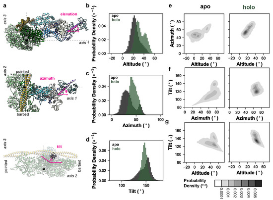 Given the observed effect of OM on the converter domain/lever arm mobility, we next analyzed the extent to which OM modulated the relative orientation of the motor domain and lever arm. Our simulations sample the conformations in the pre-powerstroke chemomechanical state, which precedes the formation of the weakly-bound actomyosin complex, so we constructed a coordinate system based on the weakly-bound state inspired by the cryo–EM work of Klebl et al. [31]. The first axis of our coordinate system perpendicularly connects the thick and thin filaments (Figure 2a). The second axis is oriented parallel to the thick and thin filaments. The third axis is normal to the plane defined by the first and second axes. The cryo–EM structure in Klebl et al. predicts that the weakly- bound state is characterized by the binding of the lower 50 kDa domain to the thin filament without closure of the actin binding cleft, and that the lower 50 kDa domain–actin interaction is similar to the interaction observed in the post-powerstroke and rigor-like conformations of the actomyosin complex. So, we aligned our simulations on the helix-loop-helix motif of the lower 50 kDa domain to the cryo–EM structure of the post-powerstroke actomyosin complex (PDB ID: 8EFE) [32]. The actin pentamer of the 8EFE structure was centered at the origin and the thin filament was oriented along axis 2. Next, we defined the tail vector based on a line connecting the backbone heavy atoms (Cα, C, and N) from residues 769–771 to 784–787. Only the N-terminal region of the tail up to the ELC binding site were included because the C-terminal region can curve during the simulations. This crossbridge centric coordinate system should assess the effects of structural perturbations on the orientation of myosin motors in the sarcomere more precisely than those approaches that measure the tail orientation via myosin-centric measures. The angle of the tail was then calculated using three angles: the elevation of the tail relative to axis 1 (35° in the X-ray structure), the azimuth of the tail relative to axis 1 (43° in the X-ray structure), and the tilt of the tail relative to axis 3 (142° in the X-ray structure) (Figure 2a). The holo simulations had a greater average tail elevation relative to the apo simulations (33° vs. 23°, respectively) (Figure 2b). The holo simulations had a greater tail azimuth relative to the apo simulations (45° vs. 34°) (Figure 2c). The holo simulations had approximately equal tilt relative to the apo simulations (147.1° vs. 146.9°) (Figure 2d). For all measured angles, the presence of OM reduced the conformational heterogeneity of the tail (Figure 2b–d). This shift in the tail orientation and reduction in the conformational entropy was further observed in the 2D probability density distributions for all combinations of measured angles (Figure 2e–g). Supplemental Movies S1–S4 depict run 1 of the apo and holo MD trajectories studied here. To better highlight the range of conformations sampled by the lever arm we binned the apo and holo run 1 trajectories according to the value of the elevation angles. The trajectories were binned into twenty 5° wide bins and the coordinates in each bin were averaged. Then, we generated the nonphysical trajectories that morph between the bin-averaged conformers via coordinate interpolation. These movies show the dynamic range of motion for the lever arm along the elevation angle for the apo (Supplemental Movie S5) and holo (Supplemental Movie S6) simulations. For averaging, trajectories were aligned on residues at the motor domain–lever arm junction. Due to the averaging and interpolation procedures, coordinates far from the alignment site become distorted in these movies and reflect the conformational degrees of freedom within each averaging window.