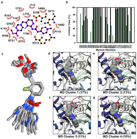 Conformational variations in OM. (a) A LigPlot [34] diagram of the 5N69 X-ray structure highlights the interactions created by OM. (b) We analyzed the fraction of simulation time (y-axis) for which any OM atom interacted with a myosin residue (x-axis). Black bars always have 100% contact time and correspond to the crystal structure, green bars correspond to the average contact time across three replicate simulations. (c) Representative structures for the top 14 MD-derived OM clusters are shown and have been aligned on the central fluorobenzene moiety to highlight the conformational variation in the terminal moieties of OM. Snapshots in panels (d–g) show the top four MD clusters corresponding to OM’s orientation in its binding pocket.