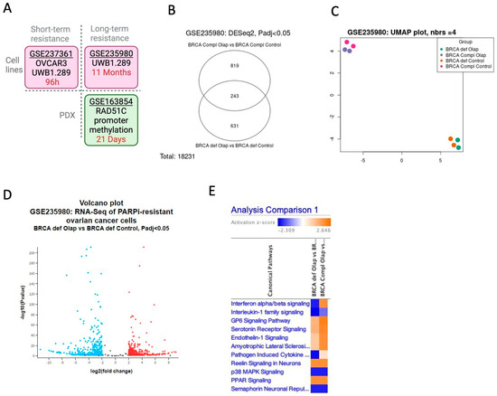 | GSE235980 | Olaparib, Niraparib, Talazoparib, Rucaparib, Veliparib | 11 months (long-time resistance) | UWB1.289 (BRCA-deficient) UWB1.289 + BRCA1 (BRCA-complemented) | [61] |
