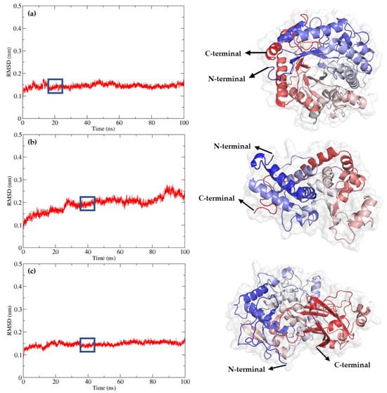 Refinement of AlphaFold2-generated models through 100 ns molecular dynamic simulations. Root Mean Square Deviation (RMSD) and refined 3D model of (a) BGL, (b) POD, and (c) PPO. The models were visualized using PyMOL, and the colors from the N-terminal to the C-terminal were based on their secondary structure.