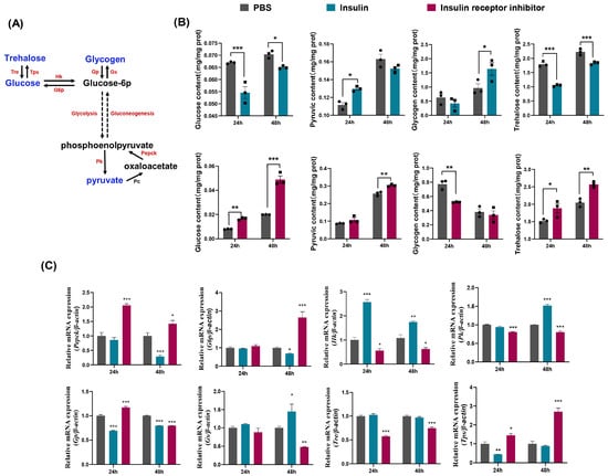 We further investigated the expression levels of key enzymes involved in glycogen and trehalose metabolism, glycogen synthase (Gs) and trehalose-6-phosphate synthase (Tps) for synthesis, and glycogen phosphorylase (Gp) and trehalase (Tre) for degradation. After insulin injection, the expression of Gp was significantly inhibited, whereas Gs was significantly activated (Figure 2C). The expression of Tps was also inhibited, but no significant change was observed for Tre (Figure 2C). These findings indicated that insulin promoted the synthesis and accumulation of glycogen but inhibited trehalose synthesis. Conversely, when insulin receptor inhibitor was applied, the Gp transcription levels increased significantly after 24 h but decreased after 48 h (Figure 2C). The expression of Gs was significantly inhibited. The Tps transcription levels increased significantly, whereas Tre was significantly inhibited (Figure 2C). These results suggested that insulin receptor inhibitor suppressed glycogen synthesis but promoted the synthesis and accumulation of trehalose. Overall, our data demonstrate the roles of insulin in modulating carbohydrate metabolism, enhancing glycogen storage, and reducing trehalose production, whereas these effects were reversed by insulin receptor inhibitor.