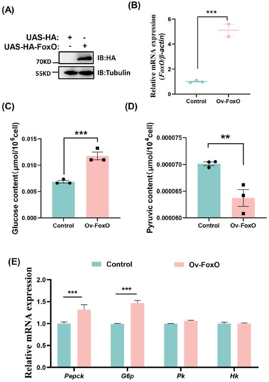Overexpression of FoxO activates gluconeogenesis. (A) Western blotting validation of the FoxO overexpression efficiency in the S2 cells. (B) qRT-PCR showing the increased FoxO expression levels after overexpression of FoxO-HA in S2 cells. (C,D) The levels of glucose and pyruvate in the S2 cells. (E) The expression profiles of Pepck, G6p, Pk and Hk in the S2 cells. Data represent means ± SE, with statistical significance indicated (** p < 0.01, *** p < 0.001).