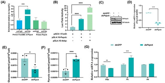 Phosphoenolpyruvate carboxykinase (Pepck) serves as a key enzyme in gluconeogenesis, where its activity is primarily regulated through transcriptional control. A FoxO-binding element (FoxOBE) comprising 5′-TTGTTAAC-3′ (−1908 to −1900 bp, relative to ATG) was predicted in the promoter region of Pepck, and the ChIP results showed that FoxO-His bound more FoxOBE than lgG (Figure 6A). To verify the results obtained by ChIP analysis, we conducted a luciferase reporter assay, and the results showed that FoxO could bind to the Pepck promoter to increase the expression of Pepck (Figure 6B). Pepck was knocked down by dsRNA to further confirm its role in the regulation of glycometabolism homeostasis (Figure 6C,D), where the glucose levels decreased (Figure 6E) and pyruvate appeared to accumulate significantly (Figure 6F). After knocking down Pepck, the G6p mRNA levels decreased with gluconeogenesis. By contrast, the mRNA levels increased for Pk involved with glycolysis, and no significant changes occurred in the expression levels of Hk involved with glycolysis (Figure 6G). These results indicated that Pepck plays a key role in maintaining glucose homeostasis, with its expression being modulated by FoxO binding, thereby influencing gluconeogenesis and glycolysis pathways.